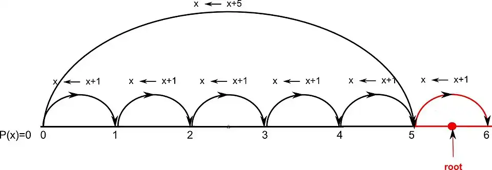 See the corresponding diagram where the root lies in the interval (5, 6). It can be easily inferred that, if the root is far away from the origin, it takes a lot of time to find its integer part this way, hence the exponential nature of Vincent's method. Below there is an explanation of how this drawback is overcome.