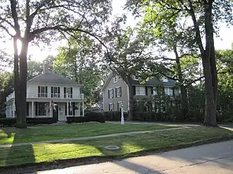 Houses are generally of modest size and are dominated by historical revival styles. An Italianate house at 481 Oakwood Avenue is among the oldest remaining houses in Lake Forest. It was built in the 1860s for Joseph Barnett. Kate McLaughlin, who would be named Lake Forest postmistress in 1887, built a house in 1883. It was later enlarged in 1919. Her successor, High Smith, built a house in 1891. Early settler John J. McIntyre built a house in 1884 after selling his farm and retiring. John Dean is thought to have built three houses in the district in the mid-1890s. Wallis Simpson, the future Duchess of Windsor, rented a house for about a year at 494 Oakwood Avenue. Lars Nielson built a duplex at 469-471 Oakwood Avenue in 1910 and lived in one of the units. The most architecturally notable house in the district is the William E. Clow, Jr. House at 461 North Green Bay Road, designed by David Adler in 1913.[2]