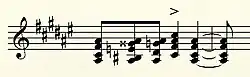 For example, Messiaen has written that "The 'Theme of Chords' is heard throughout, fragmented, concentrated, surrounded with resonances, combined with itself, modified in both rhythm and register, transformed, transmuted in all sorts of ways: it is a complex of sounds intended for perpetual variation, pre-existing in the abstract like a series, but quite concrete and quite easily recognizable through its colours: a steely grey-blue shot through with red and bright orange, a mauve violet spotted with leather-brown and encircled by bluish-purple."[3]