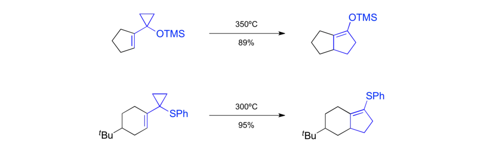 It was found that siloxyvinylcyclopropanes[31] as well as the analogous sulfinylvinylcyclopropanes[32] could be used as substrates to build annulated cyclopentene structures. Albeit these reactions still required reaction temperatures above 300 °C they were able to make useful products arising from the annulation of cyclopentene to a present ring system.