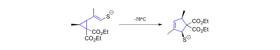Another intriguing result was reported by Larsen in 1988.[38] He was able to promote vinylcyclopropane rearrangements with substrates such as the one shown in the reaction below at temperatures as low as -78 °C. The substrates were generated in situ upon ringcontracting thiocarbonyl Diels-Alder adducts under basic conditions. This methodology allowed the formation of numerous highly functionalized cyclopentenes in a stereoselective manner.
