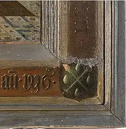 The panel is made from six horizontal boards linked by butt joins reinforced with a cylindrical rod, with the joins glued with plant fibres. The reverse is not painted, indicating it was intended to hang against a wall.[52] The frame comprises a main frame nailed and screwed at the side to two outer parts. The borders do not show signs of having hinges, indicating that the work was meant as a stand-alone panel, and not as part of a triptych.[53] The corners are assembled with mortise and tenon. Each corner is reinforced by two pegs.[54] The boards were originally painted a uniform brown, and were degraded by gloss and overprint over the centuries. Following a series of restorations, mainly by Jef Van der Veken in 1933-34 and Edmond Florens in 1977,[55] they are in good condition.[55] The inscriptions were placed on flat strips between the mouldings.[15]