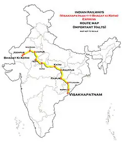 The 18573 / 18574 Visakhapatnam–Bhagat Ki Kothi Express is an Express which runs between Visakhapatnam in Andhra Pradesh and Bhagat Ki Kothi in Rajasthan. It was introduced on 2 January 2014. The Waltair railway division of the East Coast Railway division of the Indian Railways administers this train.