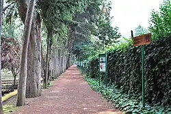 The park has an extension of 38.9 hectares,[2] located in the far west of the Coyoacán borough next to Ciudad Universitaria .[3] From its initial creation by Miguel Angel de Quevedo, the area has operated primarily as a tree nursery, growing seedlings for reforestation projects. The nursery operation produces about one million seedlings per year, which are mostly planted in and around Mexico City.[3][4] Most of the park's area is planted with trees, and it is considered to be one of Mexico City's “lungs.” Other areas are dedicated to seed beds, orchards and greenhouses.[3][5] The area used to be part of a ranch called Panzacola, and a few remains of this can still be seen such as the ruins of a small rectangular chapel and a well, with a date marking of November 18, 1918.[3]