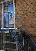 During four summer seasons (2002-2005), Ovchinnikov, a self-taught artist, made about a hundred paintings[5] on the houses of Borovsk, creating on the dull blank walls of city buildings, boarded-up windows, fences, about 90 different subjects (his famous countrymen, churches, historical events, genre scenes: a girl walking on the pipe of a pipeline, an old woman with a bucket near a downspout, a naked boy knocking at the locked door, a man with a giant cucumber in the hands, an old man in his window reading «Times», etc.). Themes are chosen and selected with the help of his wife. Many of the paintings are accompanied by poems written by Elvira.