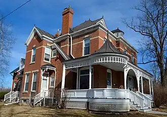 The Vogt House, also known as the Vogt-Unash House and the Kurt Vonnegut House, is a historic building located in Iowa City, Iowa, United States. The two-story, brick structure is a fine example of vernacular Queen Anne architecture.[2] It follows an asymmetrical plan and features a high-pitched hipped roof, a gabled and a round dormer on the south elevation, a two-story gabled-roof pavilion on the east, a two-story polygonal bay with a hipped roof on the west, and a single-story addition on the back. Of particular merit is the wrap-around, latticework porch that has a round pavilion with a conical roof and finial on its southwest corner.[2] There are also two outbuildings: a two-story frame carriage house to the west of the house, and a woodshed to the north of the main house.