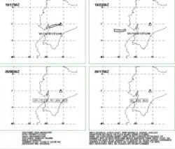 When an ash cloud is detected, the VAAC will gather all the available observations, using them in conjunction with both ash dispersion and numerical weather models, to forecast the path and evolution of the ash cloud. They will then issue a volcanic ash advisory (VAA) to aviation and meteorological offices as stated within the Handbook on the IAVW. This will be in the format of a text based message, with a corresponding graphic.