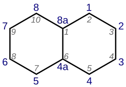 Numbered skeletal formula of bicyclo[4.4.0]decane or Decalin. The grey numbers represent numbering according to the von Baeyer nomenclature.