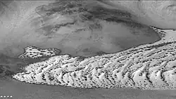 The dunes have two main features, dark dune spots and spider channels, that appear at the beginning of the Martian spring on fields covered with carbon dioxide (CO2 or 'dry ice'), mainly at the ridges and slopes of the dunes. By the beginning of winter, they disappear. The dark spots are generally round; on the slopes they are usually elongated.[2][3]