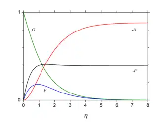 The coupled ordinary differential equations need to be solved numerically and an accurate solution is given by Cochran.[3] The inflow axial velocity at infinity obtained from the numerical integration is , so the total outflowing volume flux across a cylindrical surface of radius is . The tangential stress on the disk is . Neglecting edge effects, the torque exerted by the fluid on the disk with large () but finite radius is
