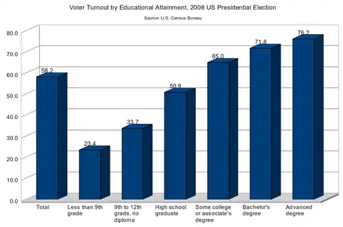 Age, income, and educational attainment are significant factors affecting voter turnout. Educational attainment is perhaps the best predictor of voter turnout, and in the 2008 election, those holding advanced degrees were three times more likely to vote than those with less than high school education. Income correlated well with the likelihood of voting as well.[29][30] The income correlation may be because of a correlation between income and educational attainment, rather than a direct effect of income.[31]