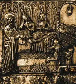 Vuk with his brother, mother and cousin Elizabeth at the deathbed of his uncle Stephen, as depicted on Chest of Saint Simeon, dated 1380. According to another interpretation, both boy figures represent Tvrtko.