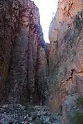 The central ranges are of a different topographical nature to the rest of the Flinders, being composed of roughly flat-lying strata, creating a high plateau into which spectacular gorges have been cut, instead of the buckled and folded strata further south which lead to the ubiquitous cuestas of Wilpena Pound. The Gammons are dominated by "The Plateau" in the southwest, which is contiguous with and of much the same height as the Blue Range further northeast, culminating in Benbonyathe Hill (1,064 m (3,491 ft)), the highest point in the Flinders north of Wilpena. Other summits on the largely flat range and plateau include Elephant Hill (with adjacent outliers North Tusk and South Tusk), Mount Changeweather, Four Winds Hill, and Prow Point. Of these "rounded hills" of the plateau, Warren Bonython writes that "at their edge the slope, which was gentle near the crest, progressively steepens and then changes dramatically into a precipice plunging down to a rock-strewn creek bed perhaps a thousand feet below"[3]