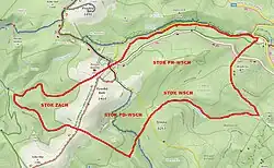 On some maps, an additional summit named Suť (1,224 m (4,016 ft) above sea level) appears on the northeastern slope of the mountain.[9] However, due to the low differentiation and exposure of this summit compared to the slope, newer studies and measurements suggest assigning this name to a part of the slope[10]