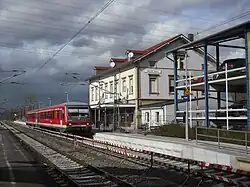 Wörth (Rhein) station—originally Wörth (Pfalz)[5][6]—is the most important station of the town of Wörth am Rhein in the German state of Rhineland-Palatinate. Deutsche Bahn classifies it as a category 5 station and it has five platforms. The station is located in the area of the Karlsruher Verkehrsverbund (Karlsruhe transport association, KVV) and it belongs to fare zone 540.[7] Since 2001, Verkehrsverbund Rhein-Neckar (VRN) tickets are also accepted for travel to or from the VRN area. The address of the station is Bahnhofstraße 44.[8]