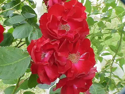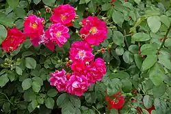 During the Second World War Wilhelm Kordes II crossed the East Asian Rosa wichurana with the Japanese Rosa rugosa eventually to obtain a new species, Rosa kordesii, able to withstand the harsh winters of north Germany. From it he later bred such famous post-war varieties as 'Parkdirektor Riggers,' 'Leverkusen,' Hamburger Phönix' and 'Heidelberg.' "The dark, glossy foliage of many modern roses can be traced back to 'Kordesii'."[1]
