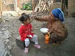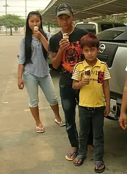 In the traditional Wa society monogamous marriage was the norm and there was sexual freedom for both men and women before marriage. The chewing of betel with areca nut was formerly also an important custom.[9] The Wa have different kinds of traditional dances. One important dance in their culture is accompanied by the beating of a large hollow wooden drum. This way of dancing, among other Wa dances[10] such as the hair dance[11] and festivals,[12] is being promoted as a tourist attraction by the Yunnan tourism authorities in China.[13] The Wa Women's Association also promotes dance, as well as other cultural and philanthropic activities.[14]
