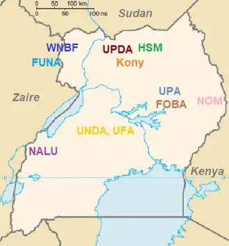 UPDA UPA HSM (Auma) HSM (Lukoya) HSM (Ojuk) UUGM HSM (Kony), UHSA, UPDCA, LA, LRA FOBA NALU WNBF FUNA UNDA, UFA NOM Tablighi Jamaat militants (including UMFF) Supported by: | ||||||