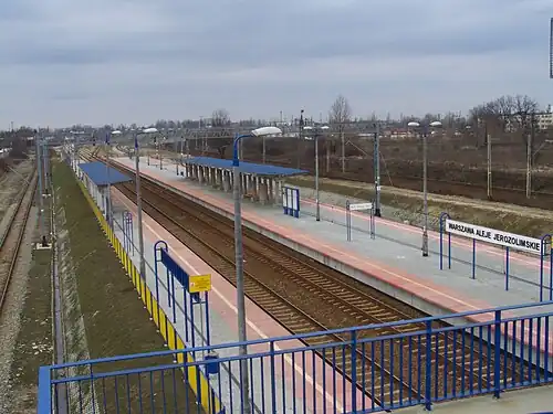 Warszawa Aleje Jerozolimskie railway station is a railway station in the Ochota district of Warsaw, Poland. The station is built on a viaduct of Aleje Jerozolimskie. It handles trains from Warszawska Kolej Dojazdowa, from Warszawa Śródmieście WKD to Grodzisk Mazowiecki Radońska and Milanówek Grudów, and Koleje Mazowieckie, from Warszawa Wschodnia via Radom to Góra Kalwaria and Skarzysko Kamienna. The platforms for the Warszawska Kolej Dojazdowa were built in 1974 as part of the realignment of the route into central Warsaw. The platforms for Koleje Mazowieckie trains were added in 2008.