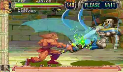 The fighting system itself is similar to previous Capcom fighting games such as the Street Fighter series with a few key differences. First of all, the vitality gauge of each computer-controlled opponent fought by the player during Quest mode is displayed across the bottom of the screen, and is much larger than the player's own vitality gauge.[5] Also, as the player lands hits on their opponents, various coins and treasure chests come out. Collecting coins provides experience points, while various items can be found in treasure chests such as orbs (used to perform super moves) and food (which replenishes the player's vitality). These elements make the game very similar to a side-scrolling action game rather than a traditional fighting game, similar to Capcom's own adaptation of the Dungeons & Dragons beat 'em up game.