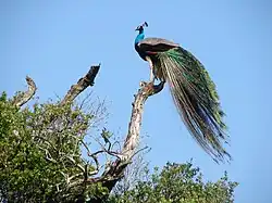 The number of bird species recorded from the park is 143.[1] This includes 8 endemic species. Endemic red-faced malkoha is a resident bird in this national park.[7] Sri Lanka junglefowl is another endemic bird inhabits the park. Lesser adjutant, yellow-fronted barbet, and Sri Lanka spurfowl are the species that visit the reservoirs and streams of the national park. Peafowl, painted stork, black-headed ibis and Eurasian spoonbill are the park's other aquatic birds.[4] Rare Sri Lanka frogmouth can be found here. Another rare species, chestnut-winged cuckoo, is near the Mahaweli River.