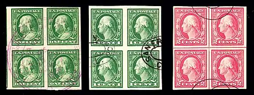 - In 1917, the New York Post office returned a batch of imperforate 2-cent stamps from the 1908–09 issue (double-line watermark, "two" spelled out) to Washington for credit. Rather than remitting cash, however, the Federal Post Office in effect transformed these stamps into a new issue by perforating them with the then-current gauge—perforated 11—and returned them to New York. A relative rarity, this issue is catalogued as Scott 519.