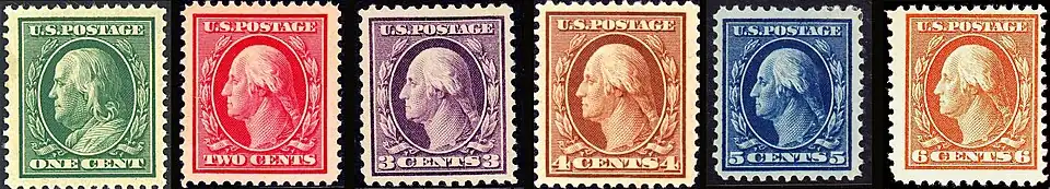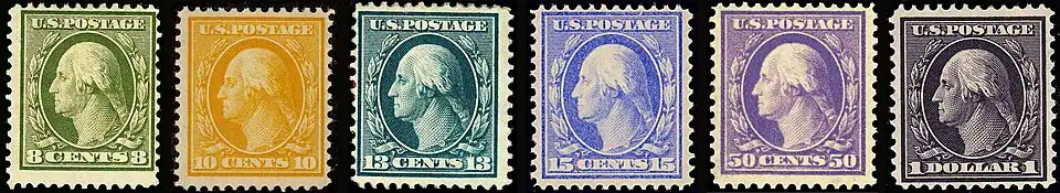 The Washington–Franklin Issues are a series of definitive U.S. Postage stamps depicting George Washington and Benjamin Franklin, issued by the U.S. Post Office between 1908 and 1922. The distinctive feature of this issue is that it employs only two engraved heads set in ovals—Washington and Franklin in full profile—and replicates one or another of these portraits on every stamp denomination in the series. This is a significant departure from previous definitive issues, which had featured pantheons of famous Americans, with each portrait-image confined to a single denomination. At the same time, this break with the recent past represented a return to origins. Washington and Franklin, after all, had appeared on the first two American stamps, issued in 1847, and during the next fifteen years, each of the eight stamp denominations available (with one exception) featured either Washington or Franklin.