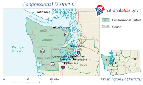 Washington's 6th congressional district encompasses the Olympic Peninsula, the Kitsap Peninsula, and most of the city of Tacoma. Its counties include the entirety of Clallam, Kitsap, Mason, Jefferson, and Grays Harbor counties, and part of Pierce County. The 6th district has been represented in the U.S. House of Representatives by Emily Randall, a Democrat from Bremerton, since January 2025.