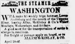 As of April 28, 1854, Washington made tri-weekly trips between Scottsburg and the mouth of the Umpqua River, departing from Allan, McKinlay & Company's wharf at Scottsburg on Mondays, Wednesdays and Fridays.[27] The company's owners advertised that "a good scow for the transportation of cattle is always in readiness."[27] One of Washington's owners was Capt. Sylvester Hinsdale (1824–1870), a former seaman and a merchant at Gardiner, Oregon, on the Umpqua River.[7]
