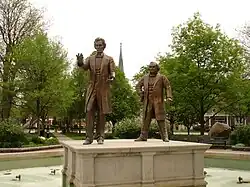 The park's central patio is dominated by a fountain and reflecting pool centered with larger-than-life depictions of Abraham Lincoln and Stephen A. Douglas.[5] The fountain and reflecting pools, and thus, the statues, are in a plaza which is surrounded by limestone. The statue project was completed by artist Rebecca Childers Caleel with metal casting completed by Art Casting of Illinois.[3] The bronze statues were completed under the guidance of the city's historic preservation commission and dedicated on September 14, 2002. The Lincoln statue is 11 feet (3.4 m) tall and the Douglas statue is 9 feet (2.7 m) tall.[3] Because of their recent installation, the statues are not part of the historic district.[4]
