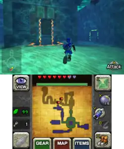 The Water Temple originally appeared in the 1998 Nintendo 64 video game The Legend of Zelda: Ocarina of Time. It is one of the levels that the protagonist Link explores as an adult.[1] The temple was constructed to worship water spirits and was guarded by Zoras.[2] It is found in Lake Hylia, which is at the time cursed by antagonist Ganondorf and an entity in the Water Temple.[2][1] The dungeon is located underneath Lake Hylia and is a large, multi-leveled dungeon. Players raise and lower the water level in wings of the dungeon to access new areas.[2] Link utilizes equipment to navigate the dungeon, including Iron Boots, a tunic that allows him to breathe underwater, and a Hookshot to hook onto distant objects.[2][3] Link battles his alter-ego Dark Link in the Room of Illusion, which features shallow water and a lone tree on a patch of land.[4] At the end, Link faces the dungeon's master, Morpha, a large water amoeba creature.[4] Upon its defeat, Link warps to the Chamber of Sages, where the Sage of Water, Princess Ruto, bestows onto him the Water Medallion. Afterwards, Lake Hylia returns to normal. Another version of Ocarina of Time was released called The Legend of Zelda: Ocarina of Time Master Quest, which features harder versions of each dungeon, including the Water Temple.[1] Game director Eiji Aonuma cited his love for deep-sea diving as his inspiration for the Water Temple, utilizing diving-based puzzles to reflect this.[5]