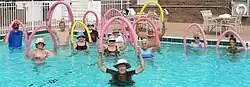 Water aerobics (waterobics, aquarobics, aquatic fitness, aquafitness, aquafit) is the performance of aerobic exercise in water such as in a swimming pool. It is done mostly vertically and without swimming typically in waist deep or deeper water. Water aerobics is a form of aerobic exercise that requires water-immersed participants. Most water aerobics is in a group fitness class setting with a trained professional teaching for about an hour. The classes focus on aerobic endurance, resistance training, and creating an enjoyable atmosphere with music. Different forms of water aerobics include: aqua Zumba, water yoga, aqua aerobics, and aqua jog.