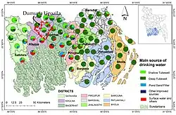 In June 2019, the Department of Public Health and Engineering (DPHE), the national lead agency for provision of rural water supply, reported a total of 1.8 million waterpoints, of which 91% were functional. These waterpoints included 1.27 million shallow and 0.47 million deep tubewells, while the remaining are split between pond sand filters, ringwells and rainwater harvesting systems.[24] Tubewells serve as the main source of drinking water in rural Bangladesh, with access to water for rural populations increasing from 65% in 1990 to 97% in 2015.[24]
