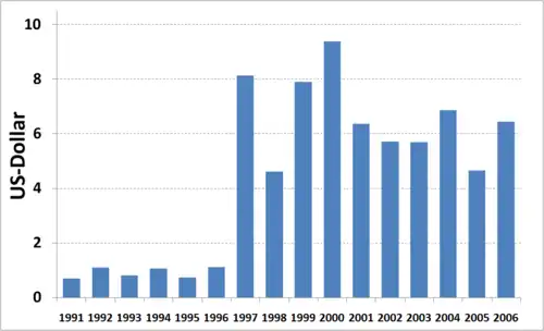According to the Nicaraguan Unidad Pública de Inversiones or Public Investment Unit, investments in water and sanitation from 1991-2006 were US$351 million or on average USD 22 million per year. This corresponds to 0.49% of GDP or US$4.5/capita/year. Within that period investment levels increased substantially in 1997. After ranging between US$0.7 and US$1.1 per capita from 1991 to 1996, it went up to US$4.7 to US$9.4 from 1997 to 2006.[27] All in all, the average investment level per capita and year from 1997 to 2003 is higher than in its neighboring countries Costa Rica and Honduras, but lower than in South American countries like Argentina, Peru and Colombia.[28]