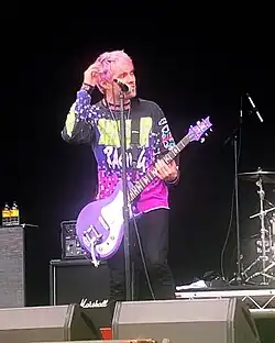 Waterparks' musical style has been mainly described as pop-punk, pop rock, electropop, alternative rock, hyperpop, hip hop, alternative pop, electronic rock, emo, neon pop, and power pop.[note 1] It also incorporates elements of punk, rap, bubblegum pop, electronic, indie, drum and bass, industrial, grunge, post-hardcore, dark pop, orchestral, emo rap, stadium rock, and lo-fi genres.[note 2] The band is said to derive their unique sound through the addition of vocal modulation, layered synthesizers, and fast vocals to the traditional rock sound.[123] Frontman Awsten has stated that he considers the group to be a rock band that has garnered significant inspiration from pop music.[124] Since the departure of former bassist Gage Matthieu, the band has remained without a bass player in its official lineup, instead performing with a rotation of fill-in bass players or using pre-recorded backing tracks in live appearances. They have cited Sum 41,[125] Blink-182,[3] Good Charlotte,[126] Kesha,[106][127] My Chemical Romance, Green Day,[9] Fall Out Boy,[3][127] No Doubt,[127] Kanye West,[127] the Beach Boys,[127] Donald Glover,[127] Tyler, the Creator,[127] Taylor Swift,[127] Chance the Rapper,[127] Linkin Park, Paramore,[3] and Saves the Day[3] as musical influences.