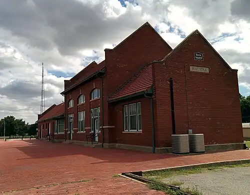Waurika station is a former railway station in Waurika, Oklahoma, United States. It opened for service on August 20, 1912 by the Chicago, Rock Island and Pacific Railroad.[1] The Wichita Falls and Oklahoma Railway (subsidiary of the Chicago, Burlington and Quincy Railroad) additionally utilized the depot when their tracks reached Waurika in 1923.[2] It was used by the railroad until 1980 and sold to the city in 1984.[3] The building was rehabilitated between 1987 and 1990 to be converted to a community space.[4] It was added to the National Register of Historic Places on March 13, 2002.[5]