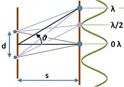 When sinusoidal waveforms add, they may reinforce each other (constructive interference) or cancel each other (destructive interference) depending upon their relative phase. This phenomenon is used in the interferometer. A simple example is an experiment due to Young where light is passed through two slits.[26] As shown in the figure, light is passed through two slits and shines on a screen. The path of the light to a position on the screen is different for the two slits, and depends upon the angle θ the path makes with the screen. If we suppose the screen is far enough from the slits (that is, s is large compared to the slit separation d) then the paths are nearly parallel, and the path difference is simply d sin θ. Accordingly, the condition for constructive interference is:[27] where m is an integer, and for destructive interference is: