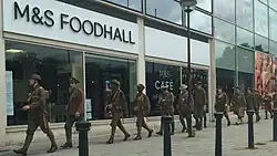 Throughout the day, some 1,600 volunteers, all men, dressed in replica British army uniforms of World War I, appeared in groups at railway stations, shopping centres and other places.[1][4] Each volunteer represented an individual, named, soldier who died on the first day of the battle.[1] When approached, they did not speak, but instead handed cards to members of the public, bearing the name, age and regiment of the person they represented, and the hashtag #wearehere.[1] Deller described these cards as "like small tombstones".[4] From time to time, the volunteers would sing the recursive refrain "We're Here Because We're Here..." to the tune of Auld Lang Syne, as sung in the trenches before the battle.[1]