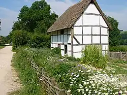 This hall house was originally built at West Lavington, West Sussex,[39] in 1609.[40] Instead of an open hall there is a central chimney with fireplaces on both ground and first floors. It retains some features from 16th-century practice, such as unglazed windows.[39] The building has a timber frame, with brick infill to the ground floor and wattle and daub infill to the first floor. It was re-erected at the museum in 1975, but the discovery of a postcard of the building at its original site showed that the chimney had not been reconstructed correctly. The chimney was rebuilt in January 2001 to a more accurate profile.[40] The house is furnished in period style.[41]
