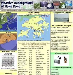 By providing information from the Hong Kong Observatory as well as other meteorological and research institutions around the world, weather enthusiasts and experts can access the information for comparison and analysis to get a more complete picture of the weather. Weather Underground also provides exclusive information including weather indices (heat index, wind chill, K index, etc.), surface and upper-level SYNOP reports for Hong Kong, upper-level weather maps for East Asia, lightning location and atmospheric electric field maps, and maps of tropical cyclone forecast tracks by different countries. Weather Underground also provides a discussion forum in both Chinese and English for weather enthusiasts and experts around the globe to gather and share their ideas on weather, climate, and other related topics.