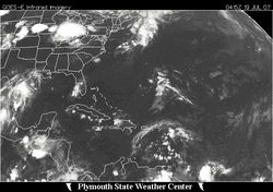 Peak summer weather July 2007. Warm humid air from the tropics meeting with cooler air over the eastern United States. Moisture condenses and forms clouds that trail up the Northeast illustrating the transfer of heat and humidity to the northeastern United States from equatorial waters. The cloud formations coincide with reported cases of Lyme from 2007.
