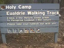 The Eualdrie walking trail leads from Holy Camp and is advertised as a 2.6-kilometre (1.6 mi) 2.5 hour return trip passing through Peregrine Lookout which takes 1.5 hours return. This was tested as 30 minutes to Perrigrine lookout, 23 minutes more to the Cairn at the summit and 40 minutes return. Peregrine Lookout is south of the carpark and from there the path turns back on itself as it proceeds upwards so that the cairn at the summit is a little north of the carpark. The path appears to continue past the cairn at Euradrie Trig (height 750 m) and can be followed down to Ben Halls Cave.[6]
