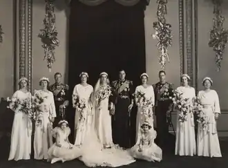 The Duke of Kent was supported by his two eldest brothers, the Prince of Wales and the Duke of York. Princess Marina was attended by eight bridesmaids:[10][11]