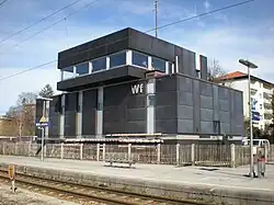 The Weilheim station originally had three mechanical signal boxes. Signal box 1 controlled movements between different parts of the station precinct and was located at the northern end of the station west of the tracks. Signal box 2 was operated by the train dispatcher and was situated south of the entrance building between the local loading tracks and the station building. Both were mechanical interlocking of the Krauss class of 1902. Signal box 3 was a mechanical interlocking of the Krauss class of 1925, which controlled the marshalling yard and was located at the southern end of the sidings to the west of the station. In 1983, the three signal boxes were replaced by a centralised signal box with a track-plan push-button interlocking of the Lorenz L60 class, which is housed in a cubic, three-storey building with an attached observation deck.[5] This signal box controls, in addition to the Weilheim station area, the Wilzhofen and Polling areas.[12] The signal box is located on the main platform north of the entrance building.