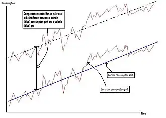 If we consider two consumption paths, each with the same trend and the same initial level of consumption – and as a result same level of consumption per period on average – but with different levels of volatility, then, according to economic theory, the less volatile consumption path will be preferred to the more volatile one. This is due to risk aversion on part of individual agents. One way to calculate how costly this greater volatility is in terms of individual (or, under some restrictive conditions, social) welfare is to ask what percentage of her annual average consumption would an individual be willing to sacrifice in order to eliminate this volatility entirely. Another way to express this is by asking how much an individual with a smooth consumption path would have to be compensated in terms of average consumption in order to accept the volatile path instead of the one without the volatility. The resulting amount of compensation, expressed as a percentage of average annual consumption, is the cost of the fluctuations calculated by Lucas. It is a function of people's degree of risk aversion and of the magnitude of the fluctuations which are to be eliminated, as measured by the standard deviation of the natural log of consumption.[6]