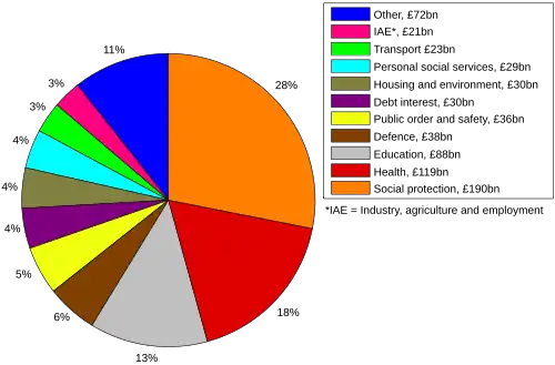 In 2023/24, it is expected that government health spending, which is the biggest element of public spending, will reach £176,200,000,000.[31] Other welfare expenses include education, which is predicted to reached £81,400,000,000, and state pensions, for which expenditure will be £124,300,000,000.[31]