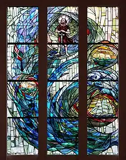 In 1970, the Holm Memorial Window was installed above the three doors leading to the cathedral's Loaves and Fishes Hall. It was designed by Beverley Shore Bennett, a leading New Zealand stained-glass artist, and made by Roy Miller of Dunedin. The window is a memorial to prominent Wellington businessman Ferdinand Holm, founder of the Holm Shipping Company, and his wife Mary. St Paul, the patron saint of the cathedral, is shown at the top of the centre panel; the top of the left panel depicts the stars of the Southern Cross and the flag of the company; three ships represent stages in the development of the company.[13]