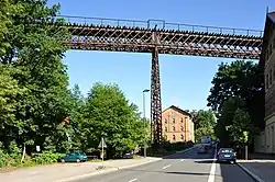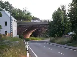 The viaduct over the Oschütz valley (Oschütztal) in Weida is the longest and most important bridge construction on the line. The 185 metre-long and 28 metre-high truss bridge is designed as a pendulum pillar viaduct (Pendelpfeilerviadukt) and is now under heritage protection. Since 1983 it has not been used for structural reasons and the junction has been moved further south.