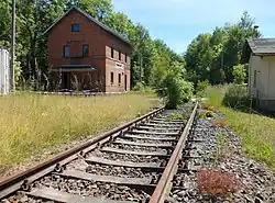 Teichwolframsdorf station was opened on 29 August 1876 as a halt and redesignated as a station in 1905. In addition to the entrance building, the station was equipped with workshops which are still partly preserved.[9] From 1953 until its closure before 1962, a railway connection from Katzendorf to Teichwolframsdorf and sächsischen Aufbereitungsbetrieben (Saxon processing operations) was used by uranium ore trains running as block trains or in groups of wagons. With the abandonment of rail traffic between Werdau and Wünschendorf (Elster), the station was closed on 30 May 1999. It is located on the outskirts of the Thuringian village of Teichwolframsdorf in the Werdau forest.