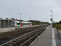 Although the Werdau–Wünschendorf–Weida section was opened on 29 August 1876, the halt (Haltepunkt) of Werdau West was opened on 1 February 1916 with the laying of the route through the urban area of Werdau. The station was closed with the abandonment of rail traffic between Werdau and Wünschendorf (Elster) on 30 May 1999. The dilapidated wooden entrance building and the platforms are still in place, but while the station sign still existed in 2006,[7] it has now disappeared. The halt is located in the western part of its track system. The street that leads to the halt, called Straße zum Westbahnhof (street to the West station), marks the former station. Werdau West is the starting point of the Werdauer Waldbahn, which is operated as a museum railway to Seelingstädt.[8]